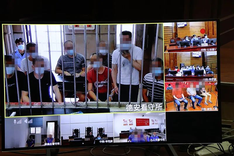 被告人蔡某彬等15人分别在九江市看守所、柴桑区看守所、德安县看守所通过远程视频方式参加庭审,被告人蔡某波等3人到现场参加庭审。被告人家属等40余人在德安县法院第一审判庭通过远程视频的方式参与了旁听。